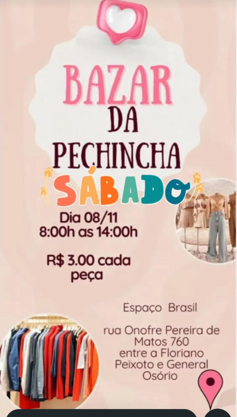 Outra destas ações é exatamente o nosso tradicional bazar beneficente que, geralmente é feito em março. Este ano não foi realizado naquela data e, por isso, eu estou pedindo a colaboração e divulgação do bazar da Pechincha, que acontece neste sábado (8), das 8h00 às 14h00, no Espaço Brasil, localizado à Rua Onofre Pereira de Matos, entre as Ruas Floriano Peixoto e General Osório, em frente à Sucata Cultural.