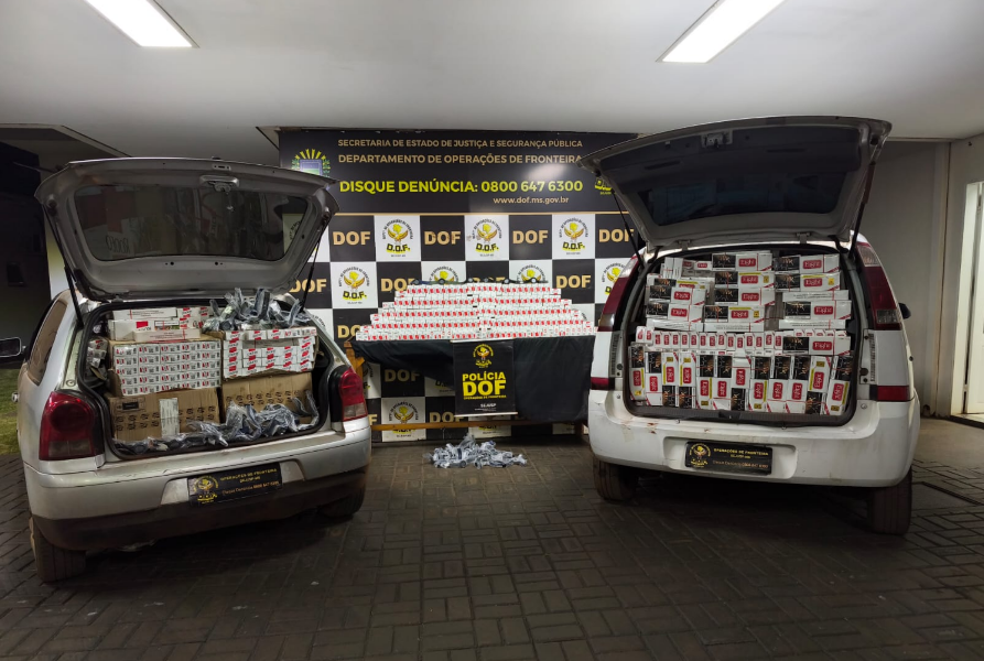 Policiais militares do DOF (Departamento de Operações de Fronteira) apreenderam, na noite de segunda-feira (26), dois veículos carregados com 3 mil pacotes de cigarros contrabandeados do Paraguai e fardos de produtos de descaminho. A ação ocorreu em uma casa no perímetro urbano de Dourados.