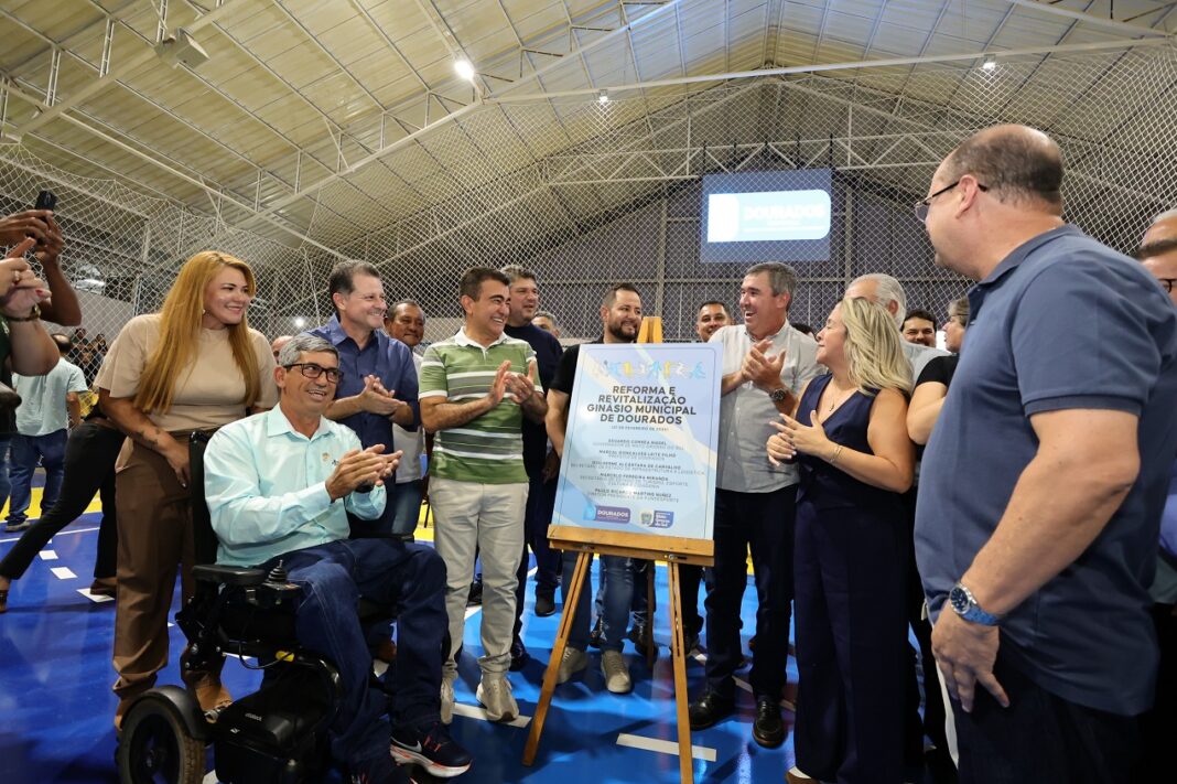 Acompanhado pelo governador Eduardo Riedel, o prefeito Marçal Filho comandou a solenidade de inauguração do novo ginásio e afirmou que espaço revitalizado com R$ 5,8 milhões coloca o município entre as principais praças esportivas de Mato Grosso do Sul